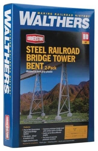 Walthers Cornerstone Steel Railroad Bridge Tower Bents are just the thing for constructing impressive steel viaducts on your layout. This kit includes parts for two tower bents used for supporting deck girder bridges of varying lengths. Add realism to your HO railroad with the Cornerstone Engineered Bridge System! Part of the Cornerstone Engineered Bridge System. Common prototype design used with various types of bridges Fits steam, diesel and modern-eras Highly detailed parts Easily cut to three different heights Two sizes of concrete pedestals included Use with Cornerstone Standard 30′, 50′ and 70′ Deck Girder Bridges (each sold separately) to model a continuous viaduct Each Steel Railroad Bridge Tower Bent measures: Width at Base: 4-1/2′ 11.4cm Width at Top: 1-13/64′ 3cm Height: 10′ 25.4cm Footings Large: 29/32′ 2.5cm Tall Small: 1/2′ 1.5cm Photo shows a typical viaduct modeled with Steel Railroad Bridge Tower Bent 2-Packs (933-4555), and 70′ Standard Level Single-Track Railroad Deck Girder Bridges (933-4507), each sold separately: Single-Track Railroad Deck Girder Bridge Kits 30′ Standard Level 50′ 70′ 90′ 30′ Low Level Steel Railroad Bridge Tower Steel Railroad Bridge Tower Bent 2-Pack