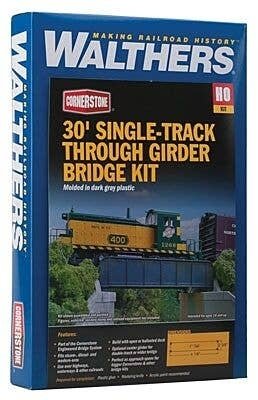 This Walthers Cornerstone 30′ Single-Track Railroad Through Girder Bridge kit is based on one of the most common North American railroad bridge designs. It′s part of the Cornerstone Engineered Bridge System and is designed to be compatible with system abutments and bridge piers. Plate-girder bridges are typically used to cross short distances between 30 and 90′ 9.1 to 30.4m. Used for many decades, this design is constructed of several steel sections riveted together to form girders. They′re known as through types as the track passes between, rather than on top of the spans. It′s ideal for use with WalthersTrack Code 83 Bridge Track 948-83004 or other trackage of your choice. The kit can be built either as a single- or a double-track bridge. Each includes parts for two complete spans, but the design makes it easy to combine additional kits (sold separately) to build a longer or wider bridge if needed. The plastic parts are molded in color and feature authentic rivets and other fine details. As shown the 30′ Single-Track Railroad Through Girder Bridge is 4-7/32 x 2-3/8 x 1′ 10.7 x 6 x 2.5cm long. Part of the Cornerstone Engineered Bridge System For more information about the Cornerstone Engineered Bridge System click here One of the most common American railroad bridge designs Used for extra clearance above highways, waterways and other railroads Fits steam, diesel and modern eras Girder heights vary with bridge length Build with open or ballasted deck Includes optional center girder for easy conversion to double track or wider right-of-way Perfect as approach spans for bigger Cornerstone and other bridge kits Easily added to new or existing scenery Authentic rivets and other details Molded in dark gray plastic