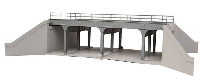 Combine roads and rails in any HO scene with the Cornerstone Urban Road & Rail Overpass kits. These highly detailed HO structures are typical of common designs in use from the 1900s on as increasing auto traffic made replacement of grade crossings a better option, and many are still in use today. A realistic addition to commercial, industrial and suburban areas, they′re also easy to use with the Cornerstone Asphalt, Brick and Concrete Street System kits (each sold separately). Each model features detailed plastic parts, molded in concrete and dark gray colored plastic. For more information about the entire Cornerstone Engineered Bridge System click here The Urban Steel Overpass Kit features: Typical of steel overpasses built in industrial and commercial areas from 1920s on Builds double-track railroad ballasted deck-bridge with 2-lane roadway below Scale 14′ (4.2m) clearance between roadway and bridge deck Highly detailed girders, beams and columns with scale rivets molded in medium gray Separate wing walls can be installed to fit straight or angled installations Measures: Overall Size with Wing Walls: 12-3/8 x 9-1/16 x 3-1/16′ 31.4 x 23 x 7.7cm Bridge & Abutments Only: 8-5/8 x 5′ 21.9 x 12.7cm Track Height from Street: 2-5/8′ 6.6cm