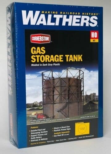 Back when coal gas was popular for home heating and lighting, the prototypes for the Walthers Cornerstone Gas Storage Tank were the signature structure of any gas works. These massive storage tanks often dominated the city skyline. These black giants were actually the last stop at the plant, used to store and pressurize the gas before it was fed into underground pipelines to supply customers. Gas was produced at a constant rate, so during the hours when demand was lower and more storage capacity was needed, the tank expanded using telescoping sections called ′lifts.′ To keep these aligned as they rose and fell, they rode on a series of guide rails supported by a spider web of steel trusses on the outside of the tank. With its intricate detail and easy construction, this model marks the first time an American-prototype gas storage tank has been available. A must-have for period city scenes, and the finishing touch for a complete gas works complex, one or two tanks can also be used where space is limited to suggest a larger plant nearby. Perfect for steam and early diesel-era layouts Use as signature structure in a gas works complex Realistic exterior trusses, with separate stairways and ladders Easy-to-build plastic kit Molded in black plastic Measures: 9-7/8′ 24.6cm Diameter x 9-1/8′ 22.8cm Tall