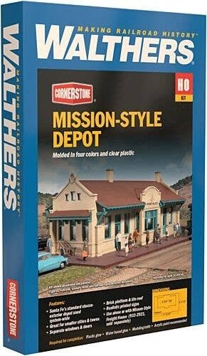 Authentic Southwestern Flavor for your Railroad The Walthers Cornerstone Mission-Style Depot is based on a standard Santa Fe design used across the railroad. Santa Fe led the pack in selling the American southwest as a vacation destination, and part of their overall program included redoing many stations with pinkish-tan stucco walls, tile roofs and mission-style trim to resemble traditional adobe buildings. Depending on the location, a matching stucco freight station (easily modeled with kit 933-2921, sold separately) was often built as an add-on to the depot or nearby as a freestanding structure. While the depot was a Santa Fe design, similarly styled stations were used on several railroads. This easy-to-build HO structure kit includes a realistic stucco structure with clay tile roof, window glazing, wood trim, a brick platform and realistic printed signs. Many still stand and most have been repurposed for other uses, so the Mission-Style Depot will look great on any layout set between the 1930s and the present. Santa Fe′s stucco-exterior depot used systemwide Use alone or combine with Mission-Style Freight Station (933-2921, sold separately) Great station for smaller cities and towns Separate windows and doors Brick platform Realistic printed signs Molded in four colors and clear The finished model measures: 11-5/16 x 6-7/16 x 3-3/4′ 28.7 x 16.3 x 9.5cm