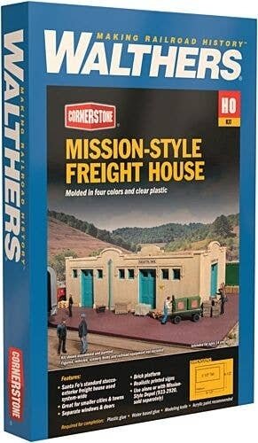 Authentic Southwestern Flavor for your Railroad The Walthers Cornerstone Mission-Style Freight House is based on a standard Santa Fe design used across the railroad. From passenger train names to stations, the Santa Fe led the pack in selling the American southwest as a vacation destination. To carry the flavor of the old west, many stations and their attached or adjacent freight station (including brick ones) were reworked with pinkish-tan stucco walls, tile roofs and mission-style trim to resemble traditional adobe buildings. While the depot was a Santa Fe design, similarly styled depots and freight houses were used on several railroads. This easy-to-build kit includes the realistic stucco structure, window glazing, wood trim, a brick platform and realistic printed signs. Several of these structures still stand in 2017 even in locations where the depot is long gone and most have been repurposed for other uses including MOW storage buildings, so the Mission-Style Freight House will look great on any layout set between the 1930s and the present. Santa Fe′s stucco-exterior freight house used systemwide Use alone or combine with Mission-Style Depot (933-2920, sold separately) Great for smaller cities and towns Separate windows and doors Brick platform Realistic printed signs Molded in four colors and clear The finished model measures: 9-1/2 x 6-1/2 x 2-1/2′ 24.1 x 16.5 x 6.3cm