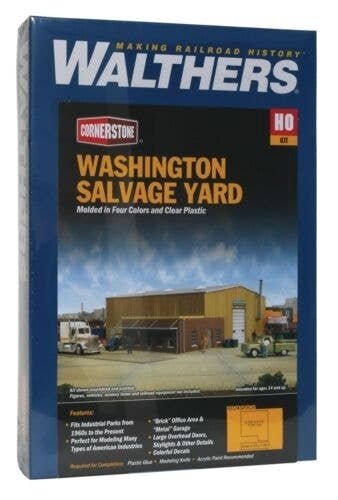 Build Scrap Metal Traffic on Your Railroad The old sayings ′everything old is new again′ and ′one man′s trash is another′s treasure′ certainly applies to salvage businesses like the Walthers Cornerstone Washington Salvage Yard. Today, the range of man-made materials being recycled into new products is growing and includes all kinds of metals, rubber, plastics, paper and more. Combining office and a large work area into one structure, Washington Salvage is typical of the main buildings at many businesses, especially today′s materials recycling facilities found in many communities. And, this combination of brick office and steel garage structure has been common since the 1960s, so your model could also serve as a county or city highway department garage, bus barn for a local mass transit authority, construction company offices, a railroad maintenance vehicle garage, truck or farm equipment dealership or any one of hundreds of similar businesses. Scrap yards, the steel industry and economic markets are closely linked. The demand, and the price paid for scrap governs how long a yard will store or how quickly it sells its scrap. If demand or prices are low for any product, volumes for that product build up and the piles get high. When demand and prices rise, stored volumes are sold off quickly to generate a profit. Washington Salvage Scrap Yard is actually two businesses - an auto salvage business and a scrap business. Washington Salvage Scrap Yard models include easy-to-build plastic kits like the main garage and office, as well as cast-resin ready-to-use scenery details like junk auto piles. Check out all of the Washington Salvage Scrap Yard and related kits! Great headquarters building for metal processors or industries handling scrap steel Corrugated metal garage with brick office annex Great for use as a maintenance garage for railroad or industrial vehicles Easy-to-build plastic kit Molded in appropriate base colors Main Building: 8-3/8 x 9-1/4 x 3-1/2′ 21.2 x 23.4 x 8.8cm Scale: 8-5/8 x 1-7/8′ 21.9 x 4.7cm