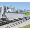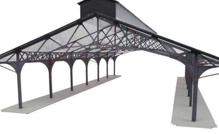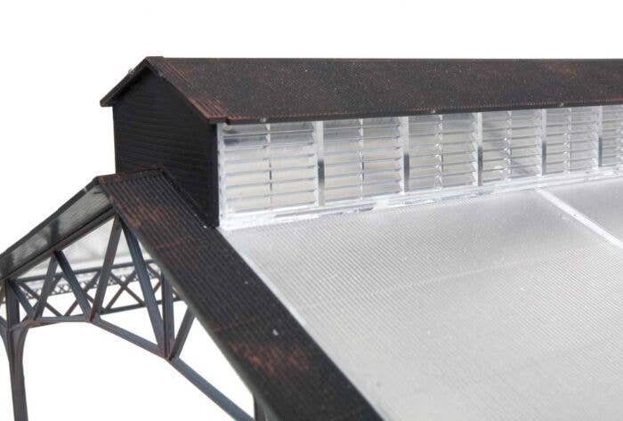 Add the realistic Walthers Cornerstone Train Shed with Clear Roof to any large HO Scale station scene! This easy-to-build model is based on the Milwaukee Road′s structure in Milwaukee, Wisconsin, but several other railroads used train sheds that were extremely similar, so it will look at home on any steam or streamliner-era layout. This kit features a translucent roof molded in clear plastic so you can see what′s under the canopy or you can paint it to leave skylight panels as used on several station sheds. Each kit includes 22-3/8′ of train shed in two sections. Kits can be easily combined for a larger shed. As shown the Train Shed measures: Shed: 22-3/8 x 11-9/16 x 6-1/4′ 56.8 x 29.3 x 15.8cm Shed Track Centers: 2-3/4′, 2′, 2-3/4′, 2′, 2-3/4′ 6.9, 5, 6.9, 5, 6.9cm Use the Train Shed with a wide variety of Cornerstone HO railroad buildings. See-through roof for easier operation and model display Typical of sheds used in many cities Great for steam or diesel-era layouts Easily enlarged by combining kits Molded in black and clear plastic