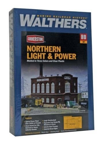 Generate revenue for your steam or diesel-era railroad with the Walthers Cornerstone Northern Light and Power powerhouse. This detailed, easy-to-build model is similar to power generating stations operated by utility companies, private industries and institutions, as well as streetcar or interurban lines. The kit features a brick main building, large smokestack, coal dump pit, separate doors, roof with vent details, tall windows and clear window glazing. Northern Light and Power also includes decal signs and complete instructions. Northern Light and Power is just one of a wide variety of Cornerstone HO Scale industrial buildings. Easy-to-build plastic kit Use as a stand-alone utility or as part of a larger industrial complex Fits 1900 and later modeling eras Tall brick smokestack Molded in appropriate colors As shown Northern Light and Power measures: 12-3/4 x 6-1/2 x 7′ 31.8 x 16.2 x 17.5cm