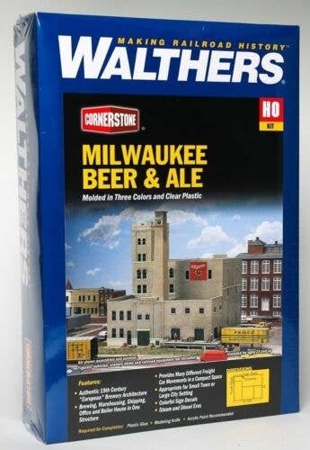 Skoal! Prost! Salut! No matter how you say it, the handsome Walthers Cornerstone HO Scale Milwaukee Beer and Ale Brewery building will be the toast of your railroad. Many started as small, local suppliers, eventually growing into huge operations, thanks to the railroads. In every era, these facilities require an amazing variety of freight cars. Boxcars and hoppers bring in grains and malt, as well as empty barrels, bottles, bottle caps or cans. Hoppers haul in coal and one or two may depart with loads of broken glass. Gondolas haul scrap aluminum. Tank cars arrive with natural gas, or corn syrup, while others carry beer in bulk. Insulated boxcars and reefers bring in hops, then haul the finished products to market. Milwaukee Beer and Ale will add plenty of operation to your present railroad, and if space is limited, it can be the main industry of a small switching layout. Its ornate trim, brick construction and various sizes and shapes of windows and doors (all molded separately) make it look right in any era. It′s perfect as the main building in a vintage scene, or as an older part of a modern complex. This easy-to-build kit as shown measures 12-3/8 x 10 x 12′ 31.4 x 25.4 x 30.5cm. Milwaukee Beer and Ale is one of many Cornerstone HO Scale industrial buildings. Vintage brick architecture Great for early-1900s to present industrial scenes Molded in appropriate colors Decal signs Easy-to-build plastic kit