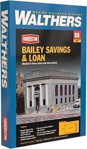 Whether used along small-town main Street or deep in the heart of a big city′s downtown, the Walthers Cornerstone Bailey Savings and Loan is an ideal addition to scenes set in the 1900s into the present. Housing dozens of employees working behind the scenes, the bank remains one of the most important (and the most common) buildings. Typically facing a busy street, bank buildings projected an image of quiet power. Bailey Savings & Loan features authentic Beaux Arts (Fine Arts) styling which used ornamental columns, arches and cut stone to project an image of power and strength. (Many libraries and city halls were constructed in this style as well.) Ideal for any business district from the 1900s to the present day, buildings like this are still common downtown and in the suburbs. As shown the kit measures: 10-1/8 x 5-15/16 x 5-1/2′ 25.7 x 15 x 13.9cm See other Cornerstone HO business buildings here. Great office space for a bank, post office, library, university or government building Classic Beaux Arts design with ornate front entrance Fits steam or diesel-era layouts from the 1900s and beyond Realistic decals for a bank and a library Detailed rooftop machinery house Easy-to-build plastic kit Molded in three colors and clear window glazing