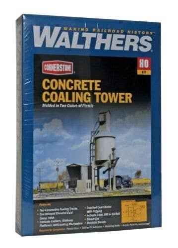 When steam ruled the rails, the prototypes for the Walthers Cornerstone Concrete Coaling Tower were familiar sights at every engine terminal. Some also stood alone on main lines, ready to service passing trains that might require refueling along the way. While early designs were made of wood, later models were made of fire-proof concrete. Hoppers of coal would be spotted for unloading above a covered dump pit. Lifting machinery hauled he coal to the top, where it was stored in the bin. Gravity and positionable chutes took over, delivering a steady stream of coal into waiting tenders below. Many of these durable structures outlived their usefulness, but proved too expensive or difficult to tear down. A few still stand, stripped of their steel hardware, a monument to days gone by. Whether alive with action or quiet and abandoned, this model can be the focal point of your engine service facilities or a great scene along your mainline. It′s complete with covered unloading pit, machinery house, lifting equipment and positionable chutes to serve two tracks. As the prototypes go, this model represents a medium sized tower, making it ideal for layouts large or small. The plastic parts feature realistic concrete and steel detailing and are molded in realistic colors. A complete set of instructions and decal signs are included. The finished Concrete Coaling Tower measures: 4-1/8 x 6-3/8 x 11′ 10.3 x 15.9 x 27.5cm with tower and shed. Must-have for steam-era layouts Serves two tracks Positionable chutes Molded in appropriate colors Easy-to-build plastic kit Molded in appropriate colors Decal signs This structure is ideal for use with the full line of Walthers Cornerstone HO railroad structures.