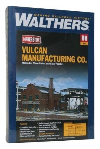 Found in many cities, the prototypes for steel fabricators like the Walthers Cornerstone Vulcan Manufacturing Co. generate lots of business for the local railroads. Raw materials arrive from the steel mills, and some finished pieces are also delivered by rail. Others are shipped by a fleet of trucks. The kit includes the detailed main building, with its realistic brickwork and tall smoke stack. Out in the yard, detailed trusses and a canopy roof are provided to model an overhead crane. Decals for the big Vulcan Manufacturing sign out front are also included. Great for steam or diesel-era layouts Brick main building with clerestory Square brick smokestack Detailed trusses and a canopy roof (Overhead Crane 933-3102, sold separately) Molded in appropriate colors Realistic decals