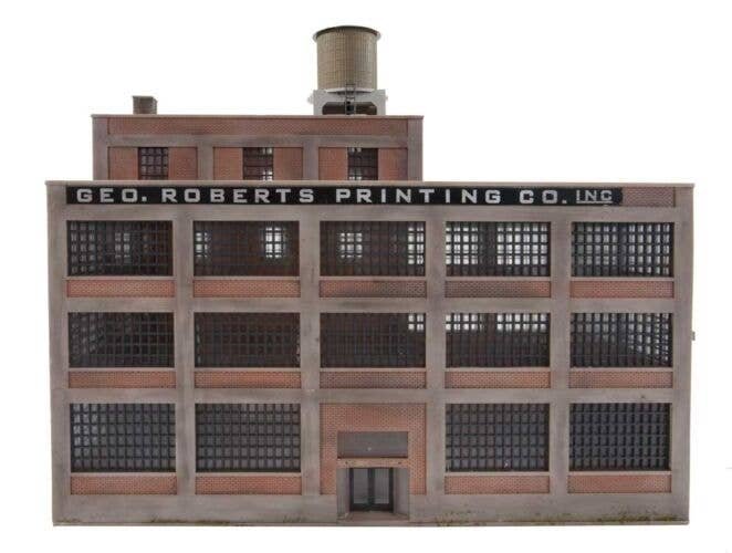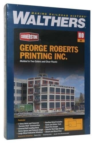 The Walthers Cornerstone George Roberts Printing Company kit is typical of concrete curtain-wall industrial buildings found in commercial and manufacturing districts in cities across the continent. Geo. Roberts Printing fits on any layout from the 1920s to the present. Large windows, a hallmark of this architectural style, provide plenty of natural illumination and made this type of building a popular choice for all types of industries. To save space in the cramped industrial district, a covered loading dock is built into the rear of the building and will add plenty of operation to your railroading. For the finishing touch, authentic ′extras′ like the rooftop water tank, three-story fire escape and colorful decal signs are included. As shown, the George Roberts Printing Company measures: 12-3/4 x 7-1/2 x 9′ 31.6 x 19.3 x 22.9cm Check out the wide variety of Cornerstone industrial buildings. Easy-to-build plastic kit Fits 1920s to present layouts Covered railcar loading dock Colorful decal signs for several businesses Molded in appropriate base colors