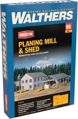 The Walthers Cornerstone Planing Mill and Shed are perfect for adding to 1900s and later sawmill operations. This set of structures, designed as accessories for the Mountain Lumber Co. Saw Mill (933-3058, sold separately) as well as other industries that use or work with lumber such as furniture factories. Inside this busy operation, rough-cut timbers are run through planners and emerge as standard sized lumber. The finished model makes a neat addition to any setting and fits in virtually any modeling era. The kit includes the two-story Main Building with board-and-batten siding, a modern Sawdust Collector with blower and storage bin, plus an outdoor Drying and Storage Shed where the finished products are allowed to air dry before being loaded for shipment by rail or truck. Finished buildings measure: Planing Mill: 6 x 8 x 5-3/4′ 15 x 20 x 14.3cm, Dust Collector: 2 x 2 x 6′ 5 x 5 x 15cm, Drying Shed: 9-3/4 x 6 x 4′ 24.3 x 15 x 10cm. See more Cornerstone railroad-served industries here. Includes three separate structures: Planing Mill Drying Shed Sawdust Collector Use with Mountain Lumber Co. Saw Mill (933-3058, sold separately) or other sawmills Easy-to-build plastic kit Molded in appropriate base colors