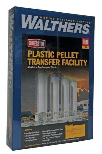 Modeling a modern Plastic Pellet Transfer is easy with this Walthers Cornerstone kit! Derived from crude oil, plastics are first formed into tiny pellets which become the raw materials for everything from soda bottles to model railroad equipment. Lightweight and easily handled by pneumatic systems, the pellets are shipped in bulk in covered hoppers and stored on-site in vertical storage tanks. Large air compressors power these facilities, which feature a number of delivery pipes and control valves. When assembled, the Plastic Pellet Transfer is great by itself at trackside as a truck reload point for local deliveries. It′s easily combined with other big industrial buildings, especially those in modern industrial parks, to create a custom plastics plant anywhere along your line. You can also use it model other types of pneumatic storage and delivery systems like those found at commercial bakeries, flour mills, chemical or fertilizer plants and many, many other industries found at modern industrial parks. The Plastic Pellet Transfer kit includes four storage silos, unloading piping for two hopper cars, walkways and railings, a compressor shed, piping and decal signs. Plus, molded-in cut lines are provided to make kitbashing fast and easy. Fits 1970s to present Four tall storage silos Includes loading rack for two cars with piping and compressor shed Overhead walkways Decal signs Easy-to-build plastic kit Molded in appropriate colors Use with buildings in the Cornerstone Modern Industrial Park series - read more here!
