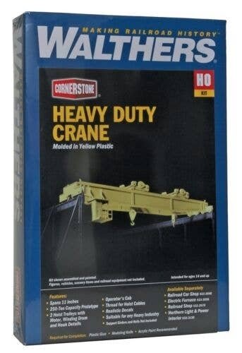 The Walthers Cornerstone HO Scale Heavy-Duty Overhead Crane is a great machine for detailing the interior of many heavy industrial structures. Easily adaptable to operations in any building, this 250-ton capacity crane is designed for maximum detail with easy construction. It includes dual trolleys with hooks and motor details, an operator′s cab, decals and instructions. It′s perfect for the craneways in any heavy industry, and will fit the supports included in the Backshop 933-3039 or the Electric Furnace 933-4604 all sold separately. Use the Heavy-Duty Overhead Crane to add realism to Cornerstone HO Scale industrial buildings. Great detail for industries Dual trolleys, operator′s cab and hook Fits craneways in several Cornerstone industries Easy-to-build plastic kit Finished model measures: 11 x 2-3/8 x 2-5/16′ 27.5 x 5.9 x 5.7cm. NOTE: Photo shows Craneway and Vertical Supports from the Overhead Traveling Crane, kit #933-3102, sold separately.