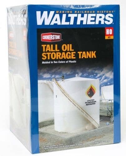 A must-have for your oil industry scenes! Surround your HO Scale Walthers Cornerstone United Petroleum Refining facility with a tank farm comprised of Tall Oil Storage Tanks with Berms. You can also use them at pipeline terminals, chemical companies, corn processing facilities, ethanol plants, port facilities and at railroad yards where they′re used for fuel and oil storage. Easy-to-build kit creates a tall 500,000-gallon tank, and includes a stairway molded to fit the tank body, berm crossover stairways and decals. Also included are modular retention berms which can be used to combine multiple tall or wide tanks into a complete scene. Use the Tall Oil Storage Tanks alongside other Cornerstone HO Scale industry kits. 500,000-gallon tall tank Tank stairways Modular retention berms with walkover stairways Perfect for oil refineries, waterfront scenes, pipeline terminals and more Finished Tall Oil Storage Tank and Berms kit measures: Tank: 6′ Diameter x 6-1/4′ Tall 15.2 x 15.9cm Retention Berms: 12-1/2 x 12-1/2′ 31.8 x 31.8cm