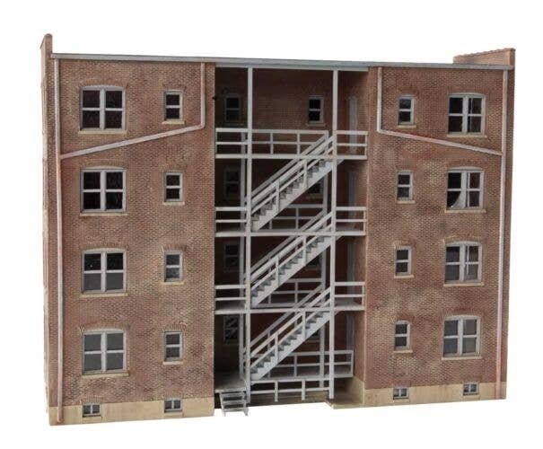 This Walthers Cornerstone Background Building provides a smooth, realistic transition between 3-D foreground scenes and printed or painted backgrounds. Generations have called brick apartments like Parkview Terrace home. Whether bright and new in the steam-era, run-down on the ′wrong side of the tracks′ in the 1970s or remodeled as upscale condos in the present, Parkview Terrace Apartments are a great way to add detailed big city buildings along your railroad right-of-way. Like the real thing, this model puts the most building in the least space. The kit can be used on the edge of your benchwork, along a shelf or modular layout and in dioramas. When placed against your background scene, or against a module skyboard, it gives the scene a deeper look in only a couple of inches. Designed for easy construction, you can build this kit as a three-story building or shorten it using cut lines molded on the inside. The building also comes with a variety of add-on details, a partial roof and colorful decals. Just add SceneMaster figures and details (sold separately) to create amazing mini-scenes. Perfect for use with other Cornerstone Series kits, this model can also be combined with the entire line of Background Buildings to create a realistic metropolitan backdrop for your favorite modeling era. Designed for use between scenery and painted or printed background Easily add depth between rearmost tracks and your backdrop Easy-to-build plastic kit Great for steam or diesel-era layouts Brick three-story building back Detailed wooden stairways with landings Fits 1920s to present layouts Molded in appropriate colors