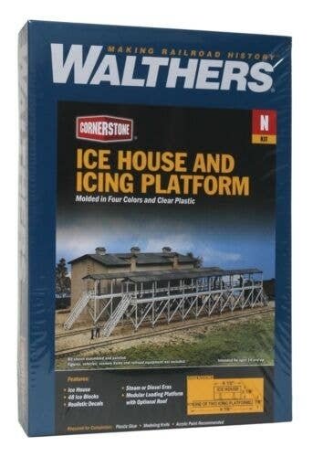 The Walthers Cornerstone Icehouse and Icing Platform brings back the heady days of railroading when fast freights forwarded meat and produce to market in ice-cooled reefers. From the 1880s to the 1970s, ice-cooled reefers were a fixture of railroading. Solid trains raced across country with their perishable loads riding in long strings of refrigerator cars. Supplying ice for the cars in transit was a huge industry. Railroads built ice houses and platforms, like this kit, about every 250-300 miles. Here, entire trains could be serviced and on the move in minutes. This complete kit includes a detailed icehouse, based on a prototype in Antigo, Wisconsin, plus a modular icing platform, from a Pacific Fruit Express design. Lots of add-on details, including an optional platform roof (used in warm areas to shade ice and slow melting), roof vents and 24 ice blocks are included. The plastic parts are molded in color for easy assembly and complete instructions are provided. As shown the Icehouse and Icing Platform kit measures: 9-7/8 x 3-3/4′ 25 x 9.5cm The Icehouse and Icing Platform is just one of a wide variety of Cornerstone N Scale industrial buildings. Prototypical wooden icehouse Found along railroads from the 1800s to the 1970s Icing platform includes optional canopy 24 ice blocks Molded in appropriate colors