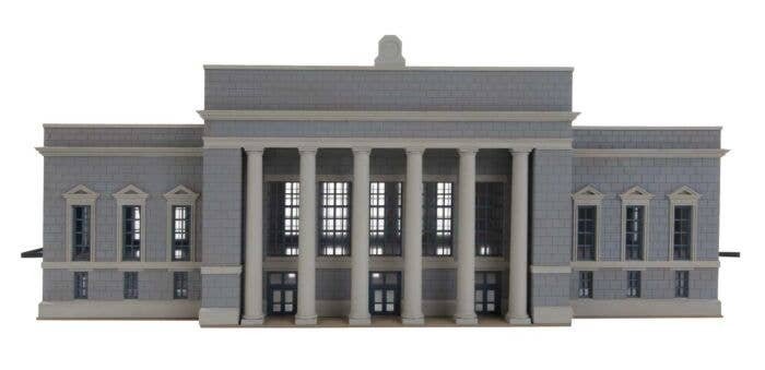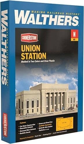 For generations of travelers, Union Station was the magical gateway to and from the world. The Walthers Cornerstone Union Station will be the gateway to your layout! Here is where the journeys of the finest trains on the line started and ended. Where travelers rushed to make their connections. And thousands of commuters began and ended their workday. Where space was limited in larger towns and cities, two or more railroads would often combine their resources to build and operate major terminal stations. Monuments to the power and success of railroading, they also projected the spirit of the community they served and the promise of excellent service for anyone who traveled by train. Union Station is a fitting tribute to the grand terminals that served railroading for over 100 years. Whether your line runs heavyweights and steam, the flashy diesel streamliners of the 40s and 50s, or any of the colorful schemes and equipment of the Amtrak-era, Union Station is an ideal focal point for passenger operations. Designed to capture the look and feel of similar prototypes across America, it puts big detail in a small space without overwhelming your layout. If space is limited, it can be the focal point of operations for an entire layout. And best of all, this unique kit is based on an American prototype, so it looks right and fits perfectly without kitbashing. All the classic design elements are here, from the tall support columns to the nonworking clock on the roof. Each wall captures the look of cut-stone construction and is molded in color so painting is an option. Separate doors and windows, along with molded-in cut lines on the back of each wall simplify customizing. The large roof is neatly detailed with large skylights and numerous vents to make it more realistic. End-door canopies, realistic decals and many other details are also included. As shown Union Station measures: 16 x 6 x 5-1/2′ 40 x 15 x 16.2cm Complete your Union Station passenger terminal with other Cornerstone railroad buildings - see them here. American Prototype Ornate front entrance with realistic cut-stone wall detail Fits steam or diesel-era layouts from the 1900s and beyond Realistic decals realistic columns, canopies and non-working clock detail Easy-to-build plastic kit Molded in appropriate colors