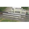 Butterfly-Style Station Platform Shelters are a great addition to the N Scale Walthers Cornerstone Union Station kit and other train depots. For passengers at any station the platform was the first and last stop for every passenger. Tall walkways allowed passengers fast and easy access to and from trains. The hard surface made it easy to wheel baggage and mail carts into place, as well as supplies for the diner or other cars. And since no one liked being too wet or warm, a roof provided some protection from the elements. As an alternate to costly train sheds, North American railroads tried three distinct styles of station platforms including the Busch, Umbrella and Butterfly types. Of these, the Butterfly (so named because of its up-swept, wing-shaped roof) was cheaper to build and eliminated the maintenance headaches of other designs. Providing plenty of ventilation for engine exhaust and just enough protection from the sun and rain for passengers, Butterfly platforms gained widespread popularity early in the 20th century. Building a detailed terminal scene for your passenger trains is easy with this kit. Based on the almost universal Butterfly design, platforms of this type can be found at stations in big cities and outlying suburbs where they have served passengers for many years. The kit includes parts for eight complete platforms and features a modular design so you can combine multiple kits to make longer platforms. Wooden walkway crossings between tracks, platform benches, detailed steel columns, platform signboards and realistic details are all included. Ideal for use with any steam, transition or diesel-era layout, Butterfly-Style Station Platform Shelters look great alongside Union Station (933-3257, sold separately) and other Cornerstone N Scale railroad buildings. Great for steam or diesel-era layouts Modular design allows easy expansion with additional kits, sold separately Molded in appropriate colors Includes benches, wooden cart crossings, signboards and other details Easy-to-build plastic kit Each platform section measures: 6-1/8 x 1-1/4 x 1-3/8′ 15.3 x 3.1 x 3.4cm
