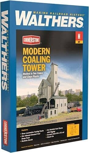 * Authentic Concrete Design * Serves Three Tracks * Coal Delivery Shed * Loaded with Separate Details * Decal Signs Included As larger engines entered service, many railroads found their older coaling towers couldn′t handle the increased demand. By the 1920s, railroads began contracting with outside firms to build new coaling towers. Concrete was the material of choice as it was easy to use, affordable, fireproof and weatherproof. Based on an Ogle design, the Modern Coaling Tower will be a focal point in any engine terminal. And towers like this were also built on the mainline to refuel engines on the road. The model features realistic ′concrete′ walls plus detailed chutes and mechanisms. Like the prototype, it can serve three tracks at once, making it an ideal choice for maximizing service in minimum space. The same sturdy construction that made these towers appealing to railroads also made them hard to get rid of! With its metal parts removed for scrap, the tower could still be standing in a contemporary scene, a reminder of how things used to be.