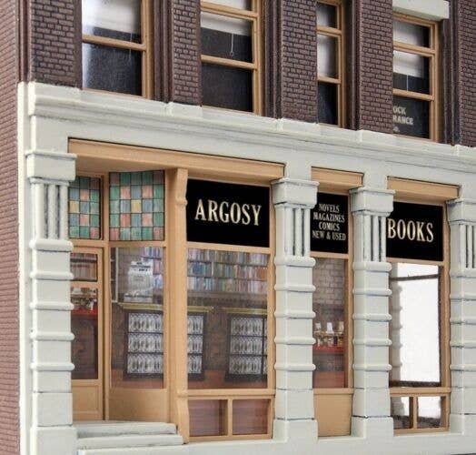 Argosy Booksellers is part of the selection of Walthers Cornerstone brick storefront building kitss patterned after those you′ll find in towns across the continent. Back in the day the family would all pile into the back of Dad′s old pick-up and rattle into town. There was something special about those old buildings. All of those fancy details and trim left an impression, even on the kids. There was always a stop at the hardware store. Mom could spend all day at Smith′s, where they had nice clothes. Kids would dream about the toys at the dime store. And the folks never could say no when they begged for ice cream! Main Street hasn′t changed much over the years and stores like Argosy Booksellers are built to last. Buildings tell a lot about your layout, especially in a business district with colorful signs that set the time and place. Modeling this important feature is easy with Argosy Booksellers because it combines a business on the first floor and apartments of offices on the second and third floors - typical of buildings constructed in the late 1800s through the 1930s and still in use today. Personalize your model with paint from your dealer, and add the finishing touch with the colorful signs in the kit. The finished kit measures: 4-3/4 x 8-1/2 x 7-1/4′ 12 x 21.5 x 18cm Three story brick corner structure Fits 1880s to present Perfect for small town or big city Use with other Cornerstone storefronts to create a business district Works with Cornerstone Street System Colorful printed signs Check out the entire Main Street USA collection here .