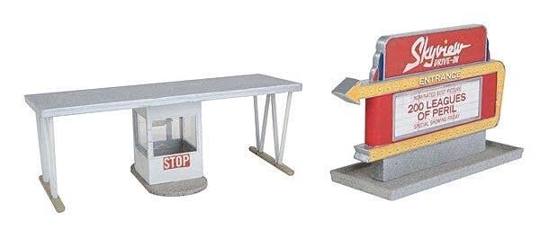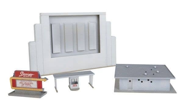 The Walthers Cornerstone Skyview Drive-In Theater brings the big screen to your layout. This easy-to-build plastic kit features a big screen designed for mounting your favorite 7′ tablet so you can play movies at your layout′s drive-in. The kit also includes a projection and concession building, drive-through box office, main entrance sign-marquee and 24 double speaker stands. Skyview Drive-In also includes printed signage and printed screen images if you decide to use it as a static model sans tablet. Build a complete city with Skyview Drive-In and other Cornerstone HO Scale businesses. Actually watch and hear your favorite movies on the big screen any time! Simply slide your tablet into the screen to bring your drive-in to life - remove at any time Works with most 7′ tablets including Apple(R) iPad mini, Amazon(R) Kindle Fire, Samsung(R) Galaxy Tab 2.0 and many more (sold separately) Compatible with tablets up to 7-7/8 x 5-5/16′ 20 x 13.4cm and from 9/32 to 15/32′ 0.7cm to 12mm thick Enjoy full sound quality from your tablet through open ports in rear of screen Perfect for 1940s to present All-American drive-in design complete with: Main screen Projection booth-concession stand building Drive-through box office Main entrance sign 24 double speaker stands - enough for 48 cars Colorful printed marquee, entrance signs and screen images Molded in three colors Skyview Drive-In′s structures measure: Concession Stand 5 x 5-1/4 x 1-1/2′ 12.7 x 13.3 x 3.8cm Screen 11 x 1-3/16 x 7-3/16′ 27.9 x 18.2 x 18.2cm Marquee: 3-5/8 x 1-1/8 x 1-7/16′ 9.2 x 2.8 x 3.6cm Ticket Booth: 3-5/8 x 1-1/4 x 2-3/16′ 9.2 x 3.17 x 5.5cm