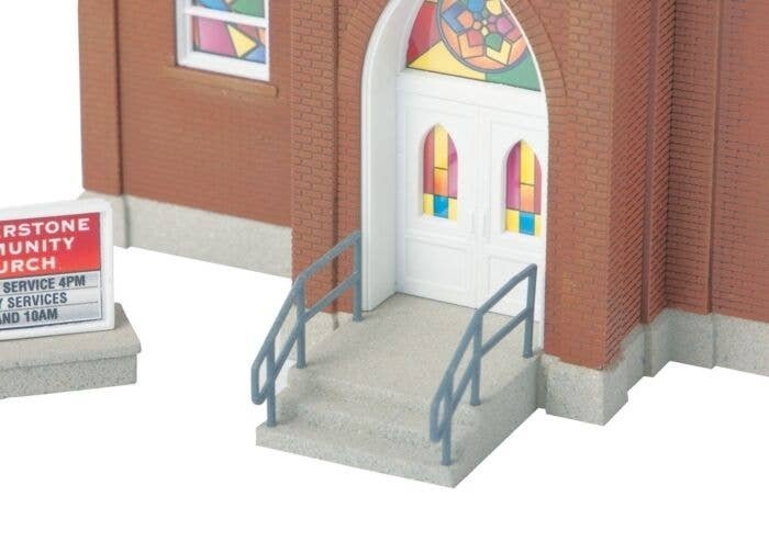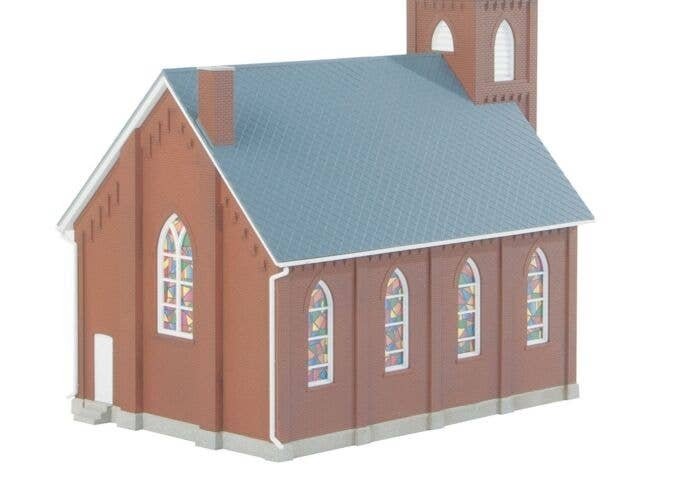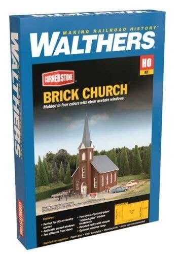 This handsome Walthers Cornerstone Brick Church kit from will be the focal point of a busy city scene, or quiet country crossroads. Typical of churches built from the 1880s on and still used today, this highly detailed structure kit features a tall steeple, two different entrances, two different front entry doors, two styles of simulated printed stained glass window treatments and printed signs. This is the style of Brick Church that looks at home anywhere across the continent, so it will look at home on your steam or diesel-era layout! Authentic arched windows Two styles of printed-paper ′stained glass′ window treatments Two different front doors Detailed belfry with steeple Realistic brick walls and diamond-shingle roof Build with standard entrance or optional ramp - parts for both styles included Front signboard with printed paper signs Molded in 4 colors with clear acetate windows