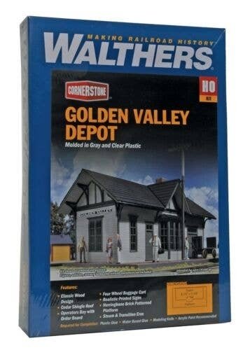 Based on a typical small town railroad building, the Walthers Cornerstone HO Scale Golden Valley Depot looks at home on steam and early diesel-era layouts. Where mainline meets Main Street you′ll find the local train station. This charming combination station (so called as it combines office, waiting room and freight room into one building) is typical of small town stations all across the US and Canada. Ideal for any era, many are still standing today and of those plenty have been repurposed as museums and businesses. This easy-to-build kit features parts molded in gray for easy painting and includes a positionable semaphore-style train order signal, a brick platform in the traditional herringbone pattern, interior walls with molded details, wooden interior floor, a baggage cart and signs. This wooden depot kit also includes station name signs matching those included with the Golden Valley Freight House (933-3533, sold separately). Golden Valley Depot is one of a wide variety of Cornerstone HO Scale railroad buildings. Great addition to steam and early diesel-era layouts Herringbone brick platform Positionable train order signal Matches architecture of Golden Valley Freight House kit 933-3533 (sold separately) Easy to build Molded in gray Includes signs As shown Golden Valley Depot measures: 6-1/2 x 3-3/8 x 4′ 16.2 x 8.4 x 10cm