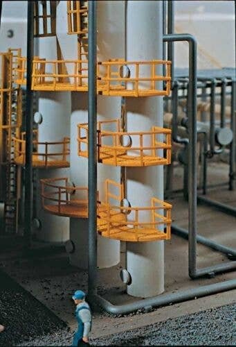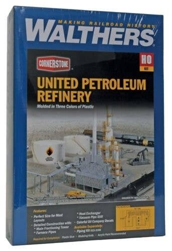 Bring oil industry traffic to your HO Scale railroad with the Walthers Cornerstone United Petroleum Refining oil refinery kit. Railroads are vital to refinery operations, from the switchers that move cars, to the mainline freights that hustle finished products to market. This kit has been carefully designed to capture the realism of a prototype oil refinery in a size that works on most layouts. The superdetailed kit includes a main fractionating tower, furnace, piping group and heat exchangers, vacuum pipe still and decal warning signs. Additional piping, safety caged ladders, platforms and photo-etched brass handrails are also included to make your model more realistic. As shown United Petroleum Refining refinery measures: 13-1/2 x 8-1/4 x 15′ 34.3 x 21 x 38.1cm United Petroleum Refining is just one of a wide variety of Cornerstone industrial buildings. Easy-to-build plastic kit Fits diesel-era layouts Main fractionating tower Furnace, piping and heat exchanger details Combine multiple kits for a larger complex Decal warning signs Molded in appropriate base colors