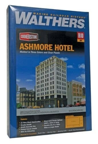 The Walthers Cornerstone HO Scale Ashmore Hotel is a high-rise structure that′s ideal for any downtown or big city layout scene. This 11-story building features a granite facade and ornate trim. It′s easily customized using three street-level facades that represent the early 1900s, the 1950s and the modern era making it great for steam or diesel-era layouts. Modular design also allows you to combine kits for a longer, wider to taller model and it can also be built as a background structure against your painted or printed backdrop scene to add depth. The Ashmore Hotel is one of many Cornerstone HO Scale business kits. 11-story block construction Granite facade Ornate trim Three different street-level facades - early 1900s, 1950s and modern Combine kits for a taller, wider or longer model Can also be built as a background structure Easy-to-build plastic kit Molded in appropriate colors and clear plastic The Ashmore Hotel as shown measures: 8-5/8 x 4-7/16 x 13-7/8′ 21.9 x 11.2 x 35.3cm.
