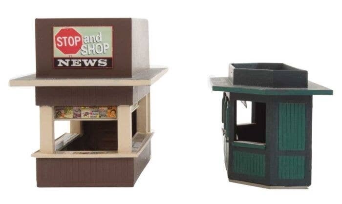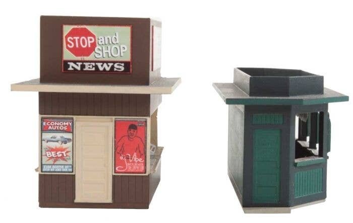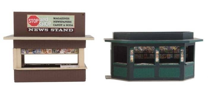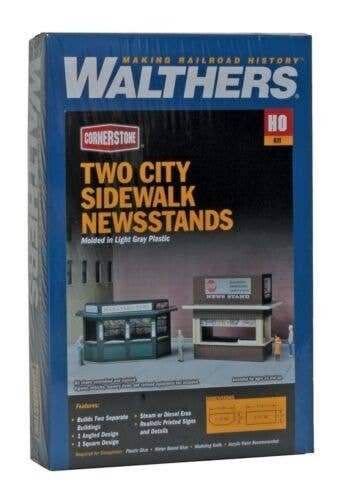 Whether offering magazines to train riders or newspapers downtown businessmen the Walthers Cornerstone HO Scale Newsstands look great in a variety of settings in any era. The kit has parts for two different news kiosks and includes detailed printed graphics of newspapers, magazines, candy displays and signs to add realism in any scene. Use the Newsstands at train stations, airports, ferry landings or along bustling streets in downtown to add interest to your layout scenes. The Newsstands kit will look great on your layout among other Cornerstone HO Scale businesses. Builds two separate newsstands Fits steam or diesel-era scenes Easy-to-build plastic kit The Newsstand structures measure: Angled-front stand: 2-1/4 x 1-1/8 x 2-1/4′ 5.7 x 2.8 x 5.7cm Rectangular stand: 3-1/8 x 1-1/8 x 1-1/4′ 7.9 x 2.8 x 3.1cm