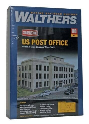 Whether used near Union Station or deep in the heart of downtown the Walthers Cornerstone United States Post Office is an ideal addition big city scenes set in eras from the first half of the 1900s into the present. Home to the Postmaster and housing dozens of employees working behind the scenes, this structure is where the business of handling mail also supports the processes to keep things running smoothly. Typically facing a busy street, these monumental buildings projected an image of quiet power. The United States Post Office building also makes a great headquarters office for all kinds of businesses and looks right at home in a city setting or at the edge of a large industrial complex. As shown it measures: 13-1/2 x 7-1/16 x 7-1/4′ 33.7 x 17.9 x 18.1cm Great office space for a post office or other large corporation Fits steam or diesel-era layouts from the 1920s and beyond Realistic decals for a high school, hospital, county courthouse and library Detailed rooftop machinery house Easy-to-build plastic kit Molded in three colors and clear window glazing