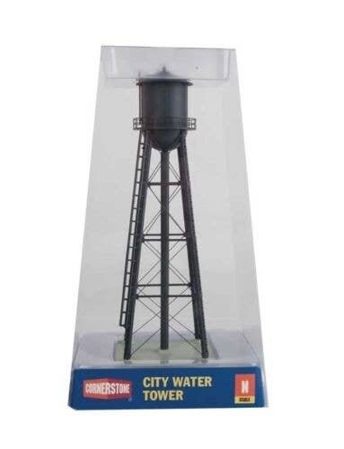 The prototypes for the assembled Walthers Cornerstone City Water Tower are landmarks in small towns, big cities and at factories. In use since the early 1900s, steel water tanks like these are still common sights today. Proudly emblazoned with the name of the town or company, you′ll also find them at hospitals, college campuses and military bases. Easy to add to layout scenes, this fully assembled model is ready to be a landmark on your layout. Authentic details include a conical roof, caged ladder, and concrete base. A set of alphabet decals is included so you can personalize your water tower with town names, industries and more. The City Water Tower is just one of a wide variety of Cornerstone N Scale structure kits. The completed City Water Tower measures: 2-3/8 x 2-3/8 x 7′ 6 x 6 x 17.7cm Fully assembled and ready for your layout Realistic latticework supports Includes alphabet decals Molded in appropriate colors