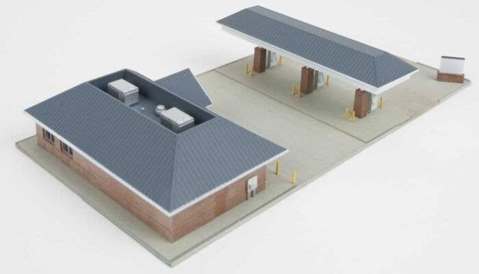 Turn an empty spot into a detailed business for your N Scale layout with the Cornerstone(R) Modern Gas Station Kit! Typical of today′s convenience store stations found in busy cities and rural areas, the kit includes a main building, car fueling island and four customizable parking lot sections (easily expanded with matching parts in the Modern Parking Lot kit (933-3886, sold separately). Other great features include: Full-color signs for Winner′s Circle Petro and Interstate Fuel and Oil Price sign, ice machine, rooftop air conditioners and vents, modern upright gas pumps safety & security posts & much more! Assembled models measure: Main Building: 5-3/4 x 3-5/8 x 1-3/4′ 14.6 x 9.2 x 4.4cm Auto Island: 6 x 1-7/8 x 2′ 15.2 x 4.7 x 5cm Parking Lot - each section: 5-3/4 x 2-7/8 x .050′ 14.6 x 7.3 x 0.127cm