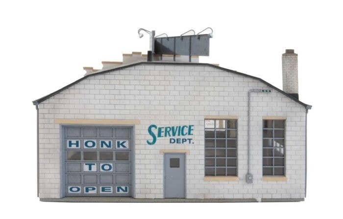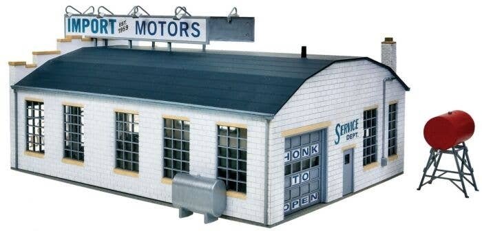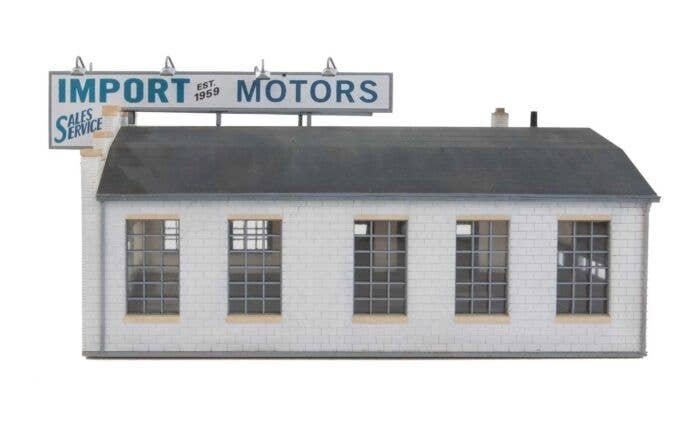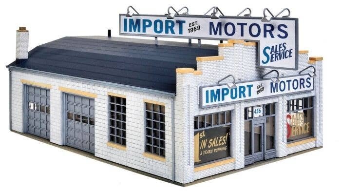 Foreign brands have been part of the American motoring scene since the early days. The Walthers Cornerstone Import Motors kit is just right for an independent dealership. It was a Benz car tootling around Detroit in the 1890s that caught the attention of an Edison Illuminating Company engineer named Henry Ford who had been working on his own idea for a car. Even as the American auto industry flourished, there was always a trickle of foreign cars as celebrities and the well-to-do selected Rolls-Royces and Mercedes. The trickle became a flood in the years following World War II: the United States was essentially the only significant new car market in the world and American GIs returned from serving in Europe with a taste for the small, sporty cars they found there. By 1959, about one car out of every ten sold in the U.S. was an import. Sales of imports dropped in the 1960s but came back strong with the oil crisis in the early 1970s, when small cars from Europe and Japan offered relief from gas lines and high prices. Since few of the European manufacturers had actual representation in America during the 1950s, 1960s and even into the 1970s, importation and distribution were usually handled by independent entrepreneurs, such as Max Hoffman in New York City, and most U.S. dealers offered several different brands. Freed from the requirements imposed by the Detroit automakers, import car dealerships were typically small and occupied a variety of different structures that offered space for a display and a service bay. Import Motors features two service bays, space for a small showroom in front and a large rooftop sign. A small lot adjacent to the building will be plenty to handle the limited inventory these businesses generally carried. Import Motors as shown measures: 7-1/4 x 5-3/8 x 3-7/8′ 18.4 x 13.6 x 9.4cm Import Motors is one of many Cornerstone HO Scale businesses. Classic 60s or 70s dealership for import car brands Multiple import brand signs included Rooftop sign Colorful decals Molded in three colors and clear plastic Easy-to-build plastic kit