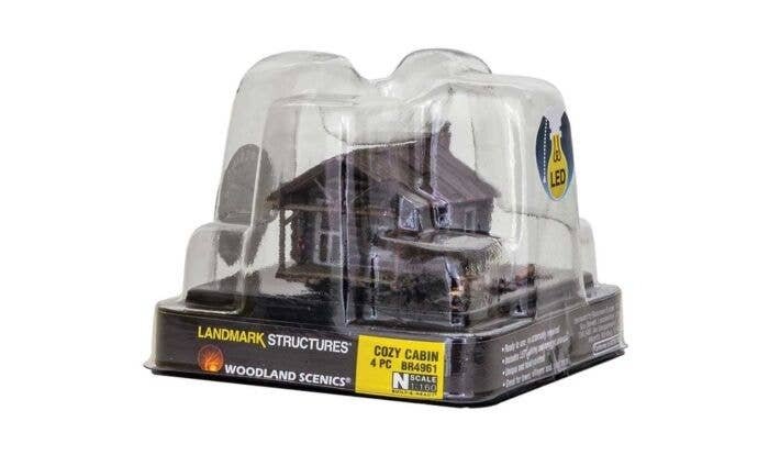 Woodland Scenics N Scale Cozy Cabin is an ideal addition to for the outskirts and rural areas of a layout. This homey building features equally detailed interior and exterior features. Look inside through the screen door at the warm, flickering 3D fireplace in the center of the back wall. A rocking chair rests next to it. Pots, pans, lanterns and deer and fish mounts clutter the walls. A giant bear rug cloaks the center of the wood floor. The building is made up of logs, sealed together with chinking and has a rusty tin roof with patches. The natural stone chimney was inspired by hand-picked creek rocks. Additional features include rock steps that lead up to the covered porch, a wash tub, a wooden bench and a stack of split wood by the side of the building. The layout-ready structure also comes with pre-installed LED lighting made for use with the Just Plug(R) Lighting System. Cozy Cabin is part of the entire line of Woodland Scenics N Scale Built-&-Ready Landmark Structures.