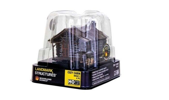 Woodland Scenics HO Scale Cozy Cabin is an ideal addition to for the outskirts and rural areas of a layout. This homey building features equally detailed interior and exterior features. Look inside through the screen door at the warm, flickering 3D fireplace in the center of the back wall. A rocking chair rests next to it. Pots, pans, lanterns and deer and fish mounts clutter the walls. A giant bear rug cloaks the center of the wood floor. The building is made up of logs, sealed together with chinking and has a rusty tin roof with patches. The natural stone chimney was inspired by hand-picked creek rocks. Additional features include rock steps that lead up to the covered porch, a wash tub, a wooden bench and a stack of split wood by the side of the building. The layout-ready structure also comes with pre-installed LED lighting made for use with the Just Plug(R) Lighting System. Cozy Cabin is part of the entire line of Woodland Scenics HO Scale Structures.