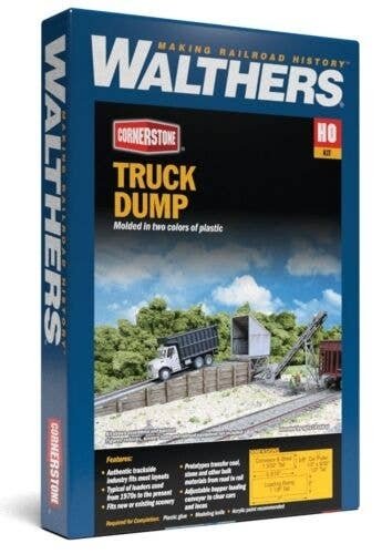 The Walthers Cornerstone Truck Dump kit is based on authentic facility used for loading all kinds of materials from dump trucks into hoppers or gondolas. This kit includes a timber-supported gravel truck ramp, corrugated-metal dump house and hopper, a positionable hopper loading conveyor that can be arranged left, right or center, and a car puller. Use the Truck Dump to add a shipping facility to any siding on your 1970s and later layout. The Truck Dump is just one of a wide variety of Cornerstone industrial buildings. Easy-to-build plastic kit Gravel truck ramp with timber walls Metal dump shed and hopper Looks at home from the 1970s to the present Perfect for use with gondolas and hoppers Positionable conveyor and car puller Molded in two appropriate colors Conveyor & Shed: 5-3/16 x 1-5/8 x 1-3/32′ 13.1 x 4.1 x 2.77cm Loading Ramp: 7 x 2 x 1-1/8′ 17.7 x 5 x 2.8cm Car Puller: 1/2 x 9/32 x 1/2′ 1.2 x 0.7 x 1.2cm