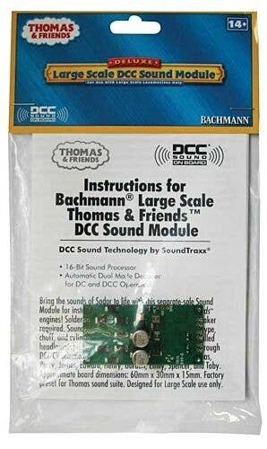 The Bachmann Soundtraxx(R) Tsumami(R) Companion Plug-and-Play Sound Module adds prototypical 16-but sound to select Bachmann locomotives. Locomotives require a factory-installed speaker and DCC decoder equipped with the special interface noted in the locomotive′s instruction guide. Bring the sounds of Sodor to life with a separate-sale Sound Module to install in your Large Scale Thomas & Friends(TM) engines. Solder pad installation and customer-supplied speaker required. Dual-mode DCC/DC operation. Sound package includes whistle or bell per prototype, chuff and cylinder blow down. Also controls customer-installed headlamp(s) if desired. Character sound suites available through DCC CV selection only. Character sound suites include Thomas, Percy, James, Edward, Henry, Gordon, Emily, Spencer, and Toby. Factory pre-set for Thomas. Approximate board dimensions: 60mm x 30mm x 15mm.WARNING: This product can expose you to chemicals including LEAD, which is known to the State of California to cause cancer and birth defects or other reproductive harm. For more information go to www.P65Warnings.ca.gov