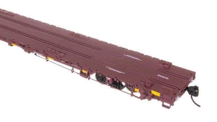 The WalthersProto HO Scale 89′ Greenbrier TTX 110-Ton Flatcar is based on prototype cars introduced in 2018. This long flatcar is especially designed for heavy-duty service, including hauling military vehicles, containers and other large loads such as wind turbine components. Supersized and super detailed, this WalthersProto 110-Ton Flatcar is sure to be a signature addition to your HO Scale collection. And if you want to model one of the most eye-catching loads on the rails, be sure to check out the SceneMaster(TM) wind turbine load (sold separately). Dual tie-down chain channels on deck Positionable, covered container pedestals match prototype equipment - hauls two 40′ or four 20′ containers (available separately) Separately applied nonworking cable straps and strap brackets Wire grab irons Highly detailed underframe w/full, separately-applied brake rods and piping Heavily weighted for outstanding performance loaded or empty Correct 36′ RP-25 turned metal wheelsets 100-ton roller bearing trucks Proto MAX(TM) magnetic metal knuckle couplers Minimum radius: 24′