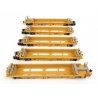 Modernize your HO Scale intermodal fleet in minutes with WaltherMainline Thrall Rebuilt 40′ Well Cars! As the 53′ container quickly became the standard for domestic shipping, older well cars built to carry 48′ boxes soon fell out of favor with railroads. Most were only a few years old, so starting in 2003 Thrall began a rebuilding program that shortened the wells to the standard 40′ on both single and five-unit cars. Today they can be seen carrying 20′ and 40′ containers in the well, with 40′ and 53′ units on top. Fully assembled and ready for service, the models feature: One time run of these roadnumbers - limited quantity, order now! 100- and 70-ton roller bearing trucks Correct 36′ and 33′ RP-25 turned metal wheelsets Heavy die-cast metal frame for superb performance empty or loaded Finely molded 3-D brake rods with chains, brake piping and weld lines on body Separate deck-mounted brake detail with piping, IBC storage boxes and realistic walkways Proto MAX(TM) metal knuckle couplers