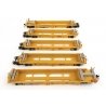 Modernize your HO Scale intermodal fleet in minutes with WaltherMainline Thrall Rebuilt 40′ Well Cars! As the 53′ container quickly became the standard for domestic shipping, older well cars built to carry 48′ boxes soon fell out of favor with railroads. Most were only a few years old, so starting in 2003 Thrall began a rebuilding program that shortened the wells to the standard 40′ on both single and five-unit cars. Today they can be seen carrying 20′ and 40′ containers in the well, with 40′ and 53′ units on top. Fully assembled and ready for service, the models feature: One time run of these roadnumbers - limited quantity, order now! 100- and 70-ton roller bearing trucks Correct 36′ and 33′ RP-25 turned metal wheelsets Heavy die-cast metal frame for superb performance empty or loaded Finely molded 3-D brake rods with chains, brake piping and weld lines on body Separate deck-mounted brake detail with piping, IBC storage boxes and realistic walkways Proto MAX(TM) metal knuckle couplers