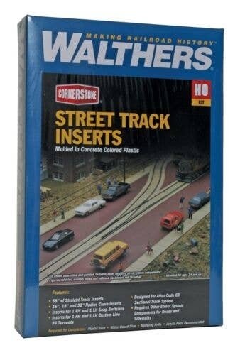 Modeling HO Scale streets with embedded track is a quick and easy job with Walthers Cornerstone Street Track Insert Set kits. In the narrow confines of most industrial areas, railroads were often forced to lay tracks embedded in the city streets. Adding this authentic detail to your layout is a snap with this kit. Sized to fit Code 83 track, the kit includes straight sections, plus pieces for 15, 18 and 22′ radius curves, and parts to fit No. 4 and 18′ radius turnouts. Simulated concrete detail in the Street Track Insert kit matches Cornerstone HO Scale Street System kits. Great for steam or diesel-era layouts Makes adding embedded track easy Fits Code 83 track and No.4 or 18′ radius turnouts Use with 15, 18 or 22′ curves Molded in appropriate color
