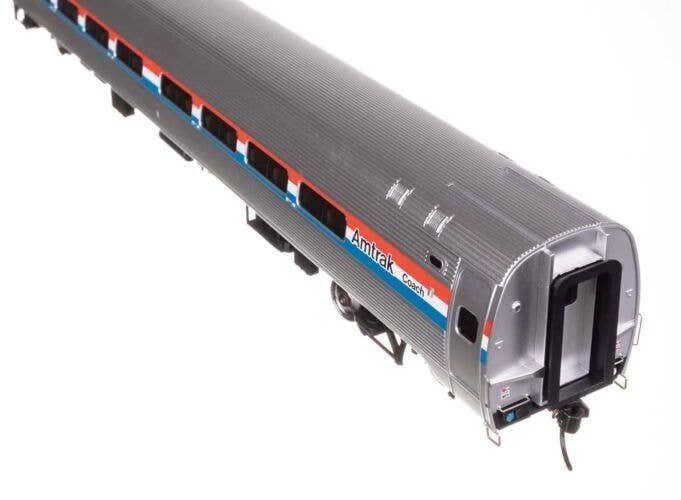 Featuring newly tooled, ultra free rolling trucks, WalthersProto HO Scale Amfleet Coaches are ready for your railroad′s passenger trains. For over 50 years prototype Amfleet cars have formed the backbone of Amtrak(R) intercity service. The cars were especially designed to handle the tunnels and other close clearances of lines in the eastern United States. Designated Amfleet I, the first group of Amfleet coaches entered service in 1975 with enough space for 84 passengers per car. In 1981 a second group of nearly identical cars, designated Amfleet II, entered service. Built especially for long-distance trains, Amfleet II coaches provided more spacious interiors and slightly larger windows for 59 passengers. Amfleet cars are available with factory printed numbers or user-applied car number decals in a variety of era-appropriate paint schemes. Walthers Amfleet coaches feature: Accurately detailed in Amfleet I and Amfleet II versions Newly designed and tooled, ultra free rolling inside bearing trucks Correct 36′ scale diameter metal wheels Simulated stainless steel finish Paint color matched to Amtrak standards Factory printed car numbers Smoked ′glass′ windows with gaskets Accurately detailed interior with optional overhead LED interior lighting Factory installed grab irons Highly detailed underframe with center and cross bracing Minimum radius: 24′ PLEASE NOTE: As these cars are the correct prototype length and feature full underbody detail to match the prototypes, a minimum 24′ radius is recommended for operation. Build your favorite Amtrak train consists with the entire line of WalthersProto and WalthersMainline HO Scale equipment! Officially licensed by Amtrak
