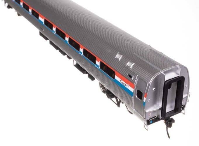 Featuring newly tooled, ultra free rolling trucks, WalthersProto HO Scale Amfleet Coaches are ready for your railroad′s passenger trains. For over 50 years prototype Amfleet cars have formed the backbone of Amtrak(R) intercity service. The cars were especially designed to handle the tunnels and other close clearances of lines in the eastern United States. Designated Amfleet I, the first group of Amfleet coaches entered service in 1975 with enough space for 84 passengers per car. In 1981 a second group of nearly identical cars, designated Amfleet II, entered service. Built especially for long-distance trains, Amfleet II coaches provided more spacious interiors and slightly larger windows for 59 passengers. Amfleet cars are available with factory printed numbers or user-applied car number decals in a variety of era-appropriate paint schemes. Walthers Amfleet coaches feature: Accurately detailed in Amfleet I and Amfleet II versions Newly designed and tooled, ultra free rolling inside bearing trucks Correct 36′ scale diameter metal wheels Simulated stainless steel finish Paint color matched to Amtrak standards Factory printed car numbers Smoked ′glass′ windows with gaskets Accurately detailed interior with optional overhead LED interior lighting Factory installed grab irons Highly detailed underframe with center and cross bracing Minimum radius: 24′ PLEASE NOTE: As these cars are the correct prototype length and feature full underbody detail to match the prototypes, a minimum 24′ radius is recommended for operation. Build your favorite Amtrak train consists with the entire line of WalthersProto and WalthersMainline HO Scale equipment! Officially licensed by Amtrak