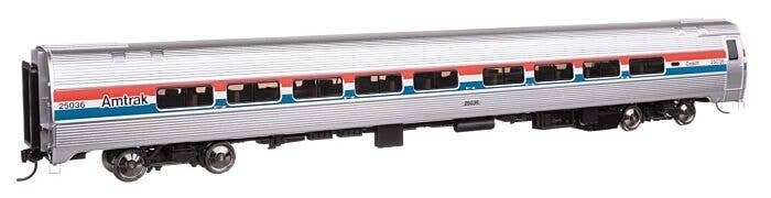 Featuring newly tooled, ultra free rolling trucks, WalthersProto HO Scale Amfleet Coaches are ready for your railroad′s passenger trains. For over 50 years prototype Amfleet cars have formed the backbone of Amtrak(R) intercity service. The cars were especially designed to handle the tunnels and other close clearances of lines in the eastern United States. Designated Amfleet I, the first group of Amfleet coaches entered service in 1975 with enough space for 84 passengers per car. In 1981 a second group of nearly identical cars, designated Amfleet II, entered service. Built especially for long-distance trains, Amfleet II coaches provided more spacious interiors and slightly larger windows for 59 passengers. Amfleet cars are available with factory printed numbers or user-applied car number decals in a variety of era-appropriate paint schemes. Walthers Amfleet coaches feature: Accurately detailed in Amfleet I and Amfleet II versions Newly designed and tooled, ultra free rolling inside bearing trucks Correct 36′ scale diameter metal wheels Simulated stainless steel finish Paint color matched to Amtrak standards Factory printed car numbers Smoked ′glass′ windows with gaskets Accurately detailed interior with optional overhead LED interior lighting Factory installed grab irons Highly detailed underframe with center and cross bracing Minimum radius: 24′ PLEASE NOTE: As these cars are the correct prototype length and feature full underbody detail to match the prototypes, a minimum 24′ radius is recommended for operation. Build your favorite Amtrak train consists with the entire line of WalthersProto and WalthersMainline HO Scale equipment! Officially licensed by Amtrak