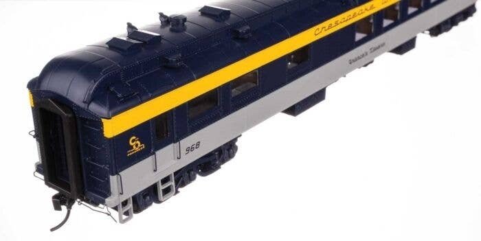 Whether you run the WalthersProto HO Scale 85′ Heavyweight 36-Seat Diner in service as-built or in the present day hauling tourists in an excursion train, you′ll get terrific value from these heavyweight diners. The gorgeous paint schemes, highly detailed interior and underbody along with the constant intensity lighting make this one of the finest dining cars available in HO Scale plastic today. We′ve included the C&O ′Gadsby′s Tavern′ in this run a historic car preserved today at Clifton Forge, Virginia. This diner is the last remaining car used on the world′s first long-distance air-conditioned train, C&O′s George Washington, starting in 1932. Based on prototypes built by Pullman C&O ′Gadsby′s Tavern,′ is the last remaining car used on the world′s first long-distance air-conditioned train, C&O′s George Washington, starting in 1932 Some ran as-is for decades while others received colorful paint jobs to match lightweight equipment Many were later rebuilt for work train service Some have been preserved in museums Perfect cars for that modern-era dinner train or excursion Detailed interior with factory-equipped overhead LED lighting Highly detailed underbody with separate brake gear, steam traps, generator and more 36 scale inch RP-25 turned metal wheels and correct Pullman trucks All wheel electrical pickup for uninterrupted, constant intensity LED lighting Add life to your new cars with the #949-6034 SceneMaster Seated Coach Passenger set, sold separately PLEASE NOTE: As these cars are the correct prototype length and feature full underbody detail to match the prototypes, a minimum 24′ radius is recommended for operation.