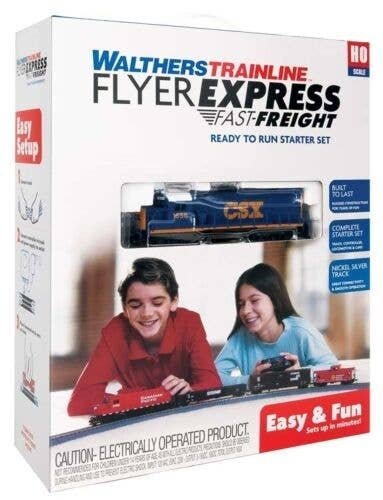 All aboard for hours of HO model railroading fun with the WalthersTrainline Flyer Express starter set. With everything you need to get going, each is complete with: Hobby-quality all-in-one sets built for years of fun Power-Loc(TM) Track with: - Nickel silver rail, brown ties and gray roadbed for more realism - Simple, sturdy construction, snaps-together without tools or rail joiners! - Includes 14 track sections to build a 38 x 45′ (0.96 x 1.1m) oval Expand any time with matching track and accessories available separately Powered GP15-1 diesel with working headlight 3 assembled cars with metal wheels and Proto MAX(TM) metal knuckle couplers: - Matching wide vision caboose - 53′ Norfolk Southern smooth side gondola - 50′ Conrail insulated boxcar Power pack and speed/direction controller Full-color ′Walthers Getting Started Guide′ for new modelers Complete set-up and operating instructions