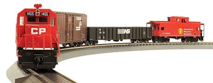 All aboard for hours of HO model railroading fun with the WalthersTrainline Flyer Express starter set. With everything you need to get going, each is complete with: Hobby-quality all-in-one sets built for years of fun Power-Loc(TM) Track with: - Nickel silver rail, brown ties and gray roadbed for more realism - Simple, sturdy construction, snaps-together without tools or rail joiners! - Includes 14 track sections to build a 38 x 45′ (0.96 x 1.1m) oval Expand any time with matching track and accessories available separately Powered GP15-1 diesel with working headlight 3 assembled cars with metal wheels and Proto MAX(TM) metal knuckle couplers: - Matching wide vision caboose - 53′ Norfolk Southern smooth side gondola - 50′ Conrail insulated boxcar Power pack and speed/direction controller Full-color ′Walthers Getting Started Guide′ for new modelers Complete set-up and operating instructions